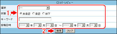 | 2. 【検索】をクリックします。やりなおす場合は【クリア】をクリックします。 |