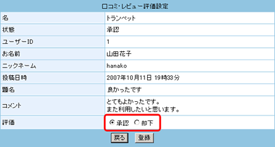 内容を確認し、ユーザーの評価(レビュー)画面への反映を承認するか却下するかを指定し、
