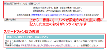 上から二番目の[※リンクが設定される文言]の欄に記入した文言の部分が、リンクになります。 例:「手続き等の詳細は」 「特定商取引法に基づく表記のキャンセル及び返品について」 ※リンクが設定される文言 「をご確認ください。」 |
